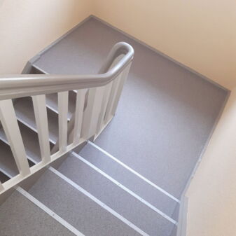 In der Katharinenstraße 38 haben wir das Treppenhaus saniert. Es wurde neu tapeziert und in hellen und freundlichen Farben gestrichen. Der alte Bodenbelag wurde durch einen pflegeleichten, hochwertigen PVC-Boden getauscht, welcher sich farblich gut in das Gesamtbild einfügt. Auch das Treppengeländer sowie die Treppenwangen wurden entsprechend neu gestrichen.