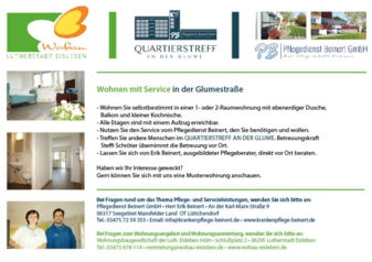 Das Projekt in Kooperation mit dem Pflegedienst Beinert geht voran. Der Gemeinschaftsraum - Das Quartierstreff an der Glume - hat im September die Türen zum ersten Mal geöffnet und die ersten Veranstaltungen durchgeführt. Die Musterwohnung ist fertiggestellt und kann besichtigt werden.
