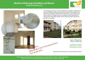 Zur Vermietung steht eine 3-Zimmer-Wohnung mit Balkon und Wanne in der Ernst-Thälmannsiedlung. Hier brauchen Sie nur noch einziehen. Die Wohnung ist modern ausgestattet mit neuen Türen, neuen Tapeten und einem schicken CV-Belag. Sie kann von Inhabern eines Wohnberechtigungsscheins angemietet werden. Ob Sie Anspruch haben, können Sie gern bei uns erfragen. Hier gelangen Sie zur Wohnung: Straße des Aufbaues 26