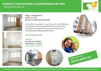 Sie suchen eine schicke 2-Raumwohnung? Wenn Sie einen WBS bekommen, dann kann dies Ihre Wohnung werden. Hier erhalten Sie ein neues Bad, neue Türen, einen modernen CV-Belag, neue Fliesen und neue Tapeten. Sie brauchen nur noch einziehen. Gern beraten wir Sie. Hier geht's zum Wohnungsangebot: Karl-Wünschmann-Straße 14