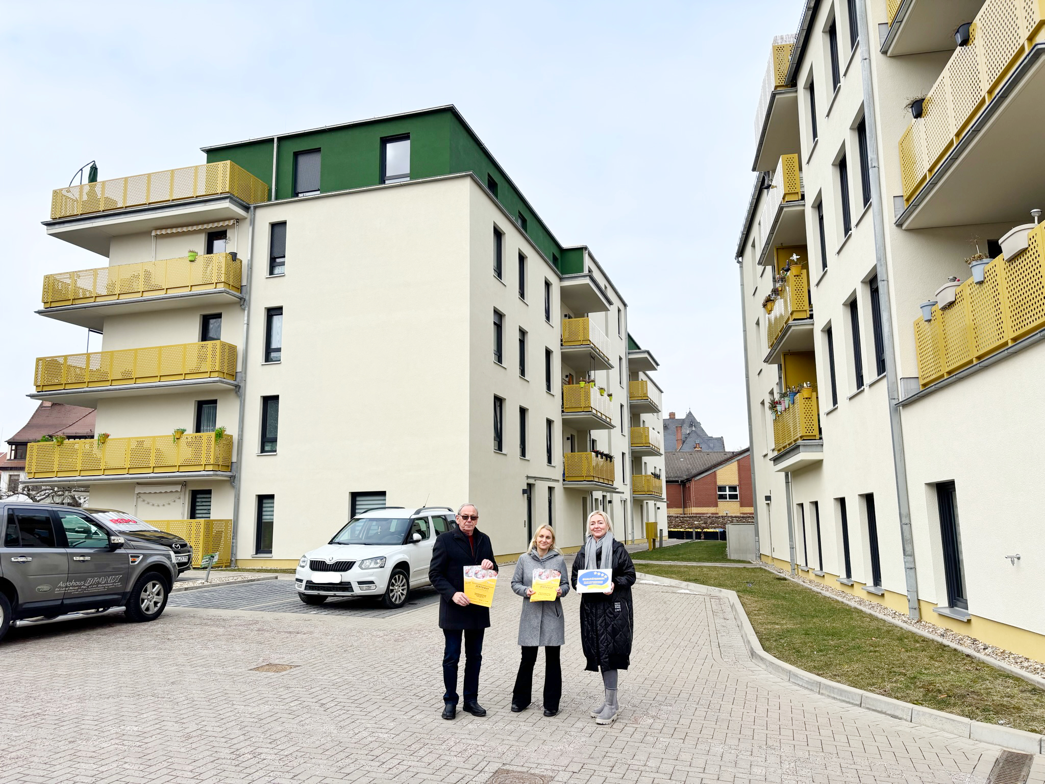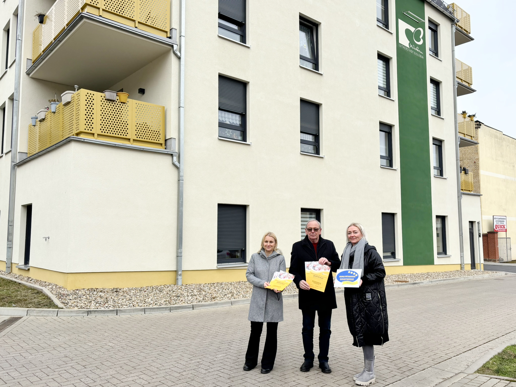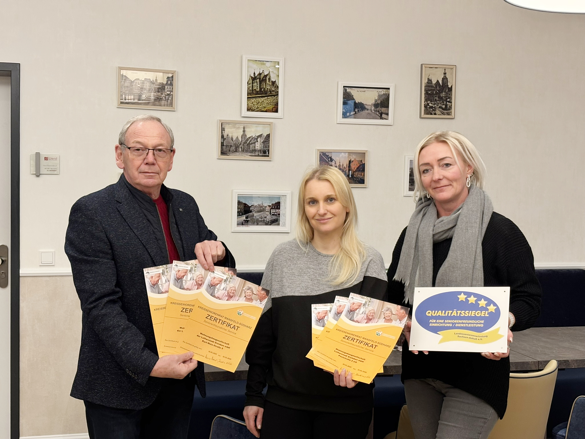 Insgesamt 6 Objekte der Wohnungsbaugesellschaft der Lutherstadt Eisleben mbH wurden erneut mit dem Zertifikat Seniorenfreundlicher Service vom Kreisseniorenrat Mansfeld-Südharz ausgezeichnet. Darunter befinden sich die Karl-Wünschmann-Str. 12, die Kurt-Wein-Str. 9, die Petrihöfe, die J.-Agricola-Straße 12-17, unsere Geschäftsräume Schloßplatz 2 und ganz neu unsere Poststraße 2a/b.