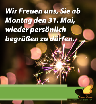 Wir freuen uns Ihnen mitzuteilen, dass wir ab Montag, den 31.05.2021 wieder persönlich für Sie da sind. Natürlich mit Abstand und Maske! Zu den gewohnten Öffnungszeiten, können Sie mit Ihren Anliegen wieder persönlich bei uns vorsprechen. Auch Wohnungssuchende können endlich wieder persönlich beraten werden.