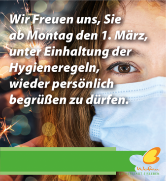 Wir freuen uns Ihnen mitzuteilen, dass wir ab Montag, den 01.03.2021 wieder persönlich für Sie da sind. Natürlich mit Abstand und Maske! Zu den gewohnten Öffnungszeiten, können Sie mit Ihren Anliegen wieder persönlich bei uns vorsprechen. Auch Wohnungssuchende können endlich wieder persönlich beraten werden.