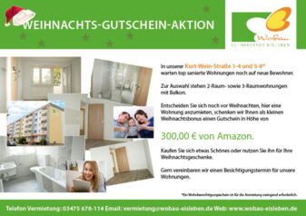 In unserer Kurt-Wein-Straße 1-4 und 5-8* warten top sanierte Wohnungen noch auf neue Bewohner. Zur Auswahl stehen 2-Raum- sowie 3-Raumwohnungen mit Balkon. Entscheiden Sie sich noch vor Weihnachten, hier eine Wohnung anzumieten, schenken wir Ihnen als kleinen Weihnachtsbonus einen Gutschein in Höhe von 300,00 € von Amazon. Kaufen Sie sich etwas Schönes oder nutzen Sie ihn für Ihre Weihnachtsgeschenke. Gern vereinbaren wir einen Besichtigungstermin für unsere Wohnungen.