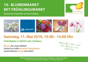 Zum 10. Mal findet unser Blumenmarkt statt. In diesem Jahr warten auf Sie u.a. zusätzlich ein kleiner Frühlingsmarkt in Zusammenarbeit mit der Lebenshilfe Mansfelder Land e.V.Unsere Mieter können sich in bekannter Weise einen Blumenkasten, den Sie selber mitbringen, kostenlos vom Gartenbaubetrieb Hörnig bepflanzen lassen. Die Lebenshilfe Mansfelder Land e.V. stellt ihre Arbeiten aus. Sie können kleine Keramiksachen, Kerzen oder Holzarbeiten für Ihren Balkon/Garten preiswert erwerben. Auch einen …