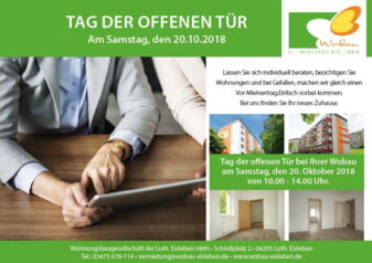Am 20. Oktober 2018 in der Zeit von 10.00 - 14.00 Uhr findet in unserem Haus, Schloßplatz 2 in 06295 Lutherstadt Eisleben unser Tag der offenen Tür statt. Kommen Sie vorbei, lassen Sie sich individuell beraten und besichtigen Sie Wohnungen. Bei Gefallen können Sie an diesem Tag für die Wohnung gleich den Vor-Mietvertrag unterschreiben.Und? Haben Sie den Termin schon im Kalender notiert?Wir freuen uns auf Ihren Besuch.