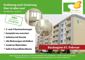 In der Kurt-Wein-Straße 1-4 und 5-8 entstehen 25 Wohnungen. Hier wird alles neu. Die Ausstattung ist modern und schick. Helle und freundliche Räume, geräumige Bäder und die modernen Materialien sprechen für sich. Es entstehen 2- sowie 3-Raumwohnungen, alle Wohnungen verfügen über einen Balkon.Baubeginn war am 01. Februar 2018. Die voraussichtliche Fertigstellung soll im Sommer diesen Jahres erfolgen, so dass wahrscheinlich im Juni/Juli die ersten Wohnungen bezogen werden können.Für die Anmietung …