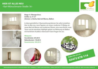 In diese gemütliche 2-Raumwohnung können Sie sofort einziehen. Hier ist alles neu, neue Tapeten, ein neuer, moderner CV-Belag, ein neues Bad mit Wanne und modernen Fliesen, eine neue Küche, neue Türen und als absolutes Highlight gehört zur Wohnung ein Balkon mit herrlichem Ausblick. Interessiert? Dann brauchen Sie nur noch einen Wohnberechtigungsschein. Fragen Sie uns. Hier können Sie sich die Wohnung anschauen: Exposé Karl-Wünschmann-Straße 16
