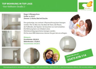 Eine geräumige, neu sanierte 3-Raumwohnung kann bezogen werden. Hier ist alles neu: Das Bad, die Türen, die Fliesen, der Fußboden, die Tapeten. Sie brauchen nur noch einziehen. Die Wohnung kann von Inhabern eines Wohnberechtigungsscheines bezogen werden. Ob Sie einen WBS bekommen, können Sie gern bei uns erfragen. Hier können Sie sich das Exposé anschauen: Von-Veltheim-Straße 2