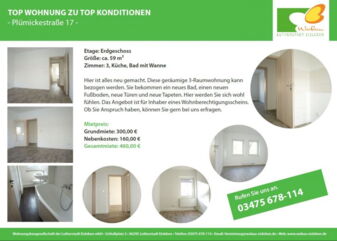 Hier ist alles neu gemacht. Diese geräumige 3-Raumwohnung kann bezogen werden. Sie bekommen ein neues Bad, einen neuen Fußboden, neue Türen und neue Tapeten. Hier werden Sie sich wohl fühlen. Das Angebot ist für Inhaber eines Wohnberechtigungsscheins. Ob Sie Anspruch haben, können Sie gern bei uns erfragen. Hier gelangen Sie zum Exposé: Plümickestraße 17