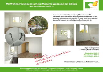 Zur Vermietung steht eine 3-Zimmer-Wohnung mit Balkon und Wanne in der Ernst-Thälmannsiedlung. Hier brauchen Sie nur noch einziehen. Die Wohnung ist modern ausgestattet mit neuen Türen, neuen Tapeten und einem schicken CV-Belag. Sie kann von Inhabern eines Wohnberechtigungsscheins angemietet werden. Ob Sie Anspruch haben, können Sie gern bei uns erfragen. Hier gelangen Sie zur Wohnung: Straße des Aufbaues 26