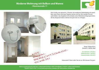 Hier ist alles neu gemacht. 3 Zimmer, ein modernen Bodenbelag, ein neues Bad, neue Türen und neue Tapeten warten auf Sie. Hier werden Sie sich wohl fühlen. Das Angebot ist für Inhaber eines Wohnberechtigungsscheins. Ob Sie Anspruch haben, können Sie gern bei uns erfragen. Zum Wohnungsangebot: Plümickestraße 17