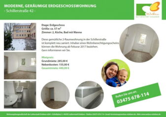 Diese gemütliche 2-Raumwohnung in der Schillerstraße 42 ist komplett neu saniert. Sie erhalten eine Wohnung mit neuem Bad, neuen Türen, einem neuen Bodenbelag und neuen Tapeten. Sie brauchen also nur noch einziehen. Inhaber eines Wohnberechtigungsscheins können die Wohnung ab Februar 2017 beziehen. Hier geht's zum Exposé: Schillerstraße 42