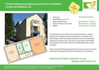 Sie suchen eine bezahlbare 2-Raumwohnung in der Lutherstadt Eisleben?Sie sind Geringverdiener, Rentner mit einer geringen Rente oder Auszubildender? Wir bieten im Dezember/Januar komplett renovierte 2-Raumwohnungen mit Wohnberechtigungsschein zu einem günstigen Mietpreis. Interessiert? Dann rufen Sie uns an.